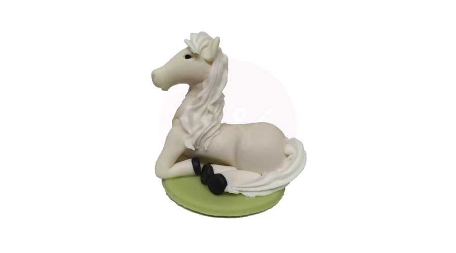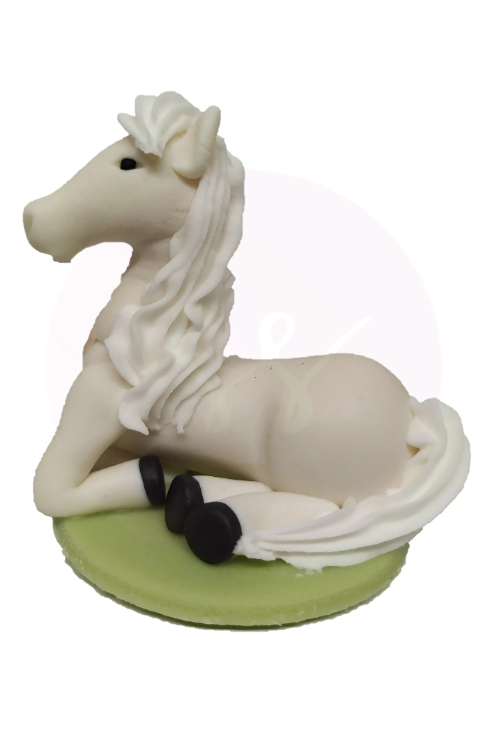Fehér fekvő lovat ábrázoló, kézzel készített marcipán figura, darabonként műanyag hengerbe csomagolva. Alkalmi torták, sütemények díszítésére, vagy önállóan ajándékként felhasználható. Súlya: ~50 gramm.