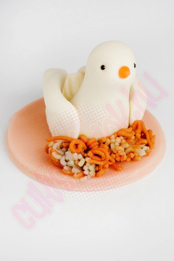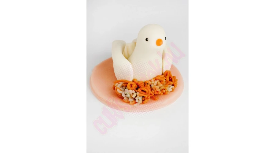Galambot ábrázoló, kézzel készített marcipán figura, darabonként celofánba csomagolva. Alkalmi torták, sütemények díszítésére, vagy önállóan ajándékként felhasználható. Súlya: ~35 gramm.