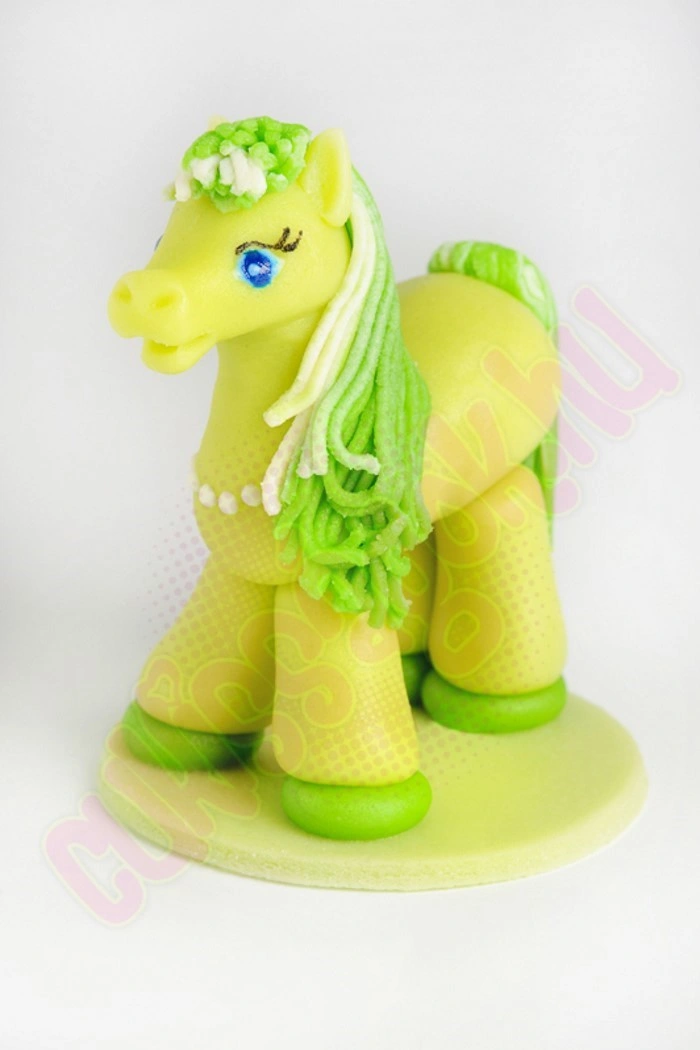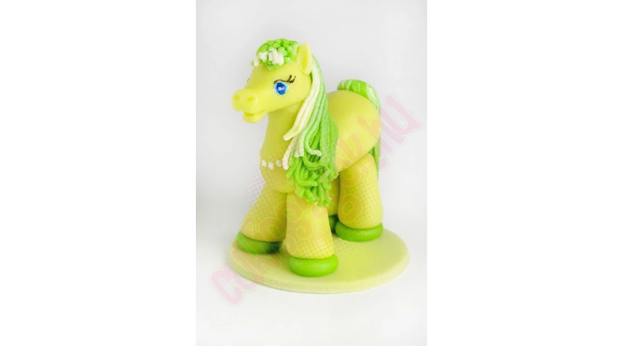 Zöld pónilovat ábrázoló, kézzel készített marcipán figura, darabonként műanyag hengerbe csomagolva. Alkalmi torták, sütemények díszítésére, vagy önállóan ajándékként felhasználható. Súlya: ~50 gramm.