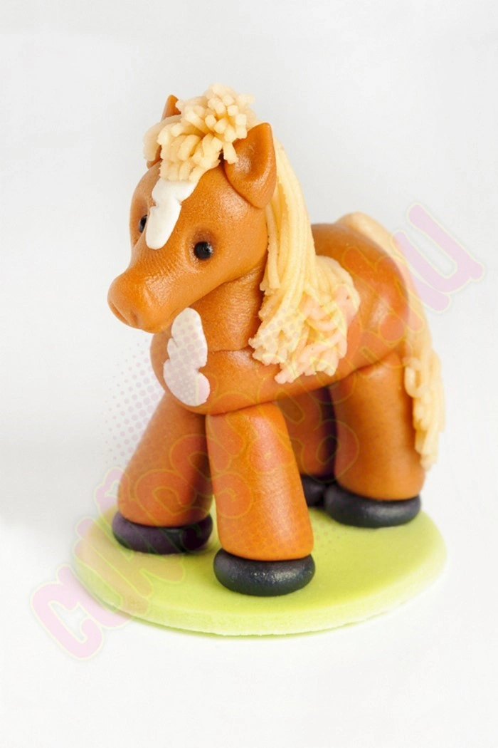Barna pónilovat ábrázoló, kézzel készített marcipán figura, darabonként műanyag hengerbe csomagolva. Alkalmi torták, sütemények díszítésére, vagy önállóan ajándékként felhasználható. Súlya: ~50 gramm.
