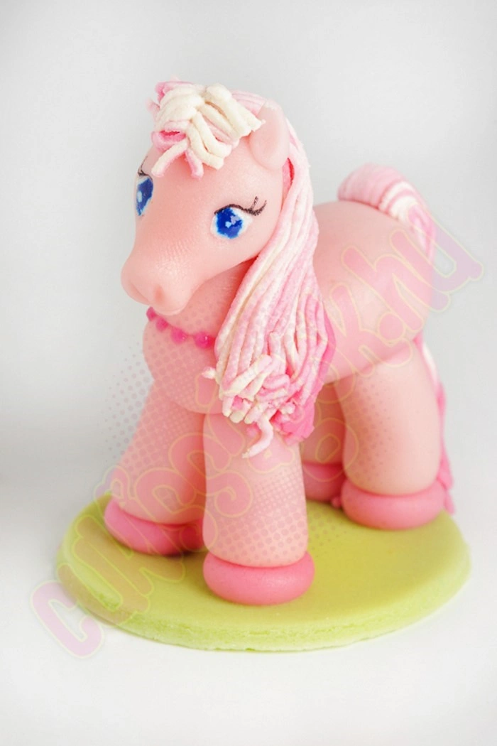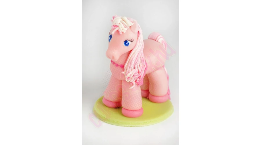 Pónilovat ábrázoló, kézzel készített marcipán figura, darabonként műanyag hengerbe csomagolva. Alkalmi torták, sütemények díszítésére, vagy önállóan ajándékként felhasználható. Súlya: ~50 gramm.